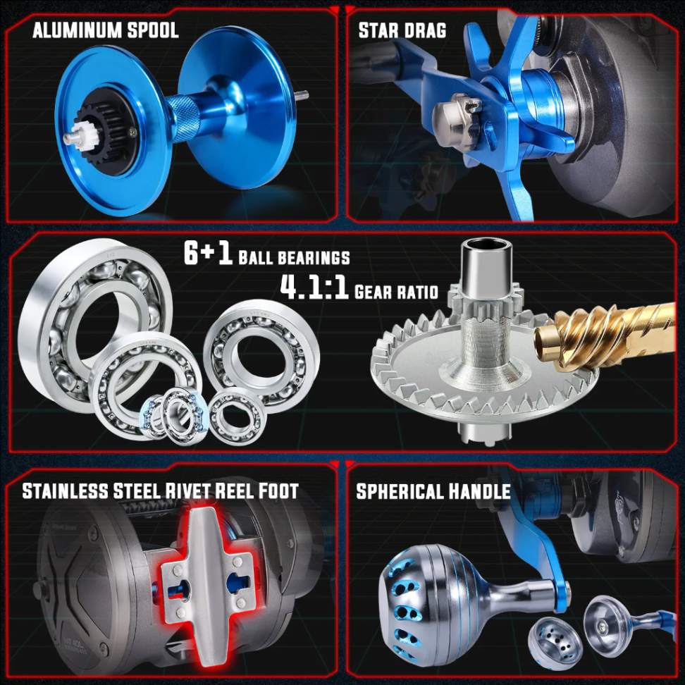 2. Detailed Parts:Conventional Reel, Machined Aluminum Spool, Bakelight Sideplates, Stainless Steel Gears for Long-lasting, Durability,Smooth Fishing Reel Seat,Spherical Handle.