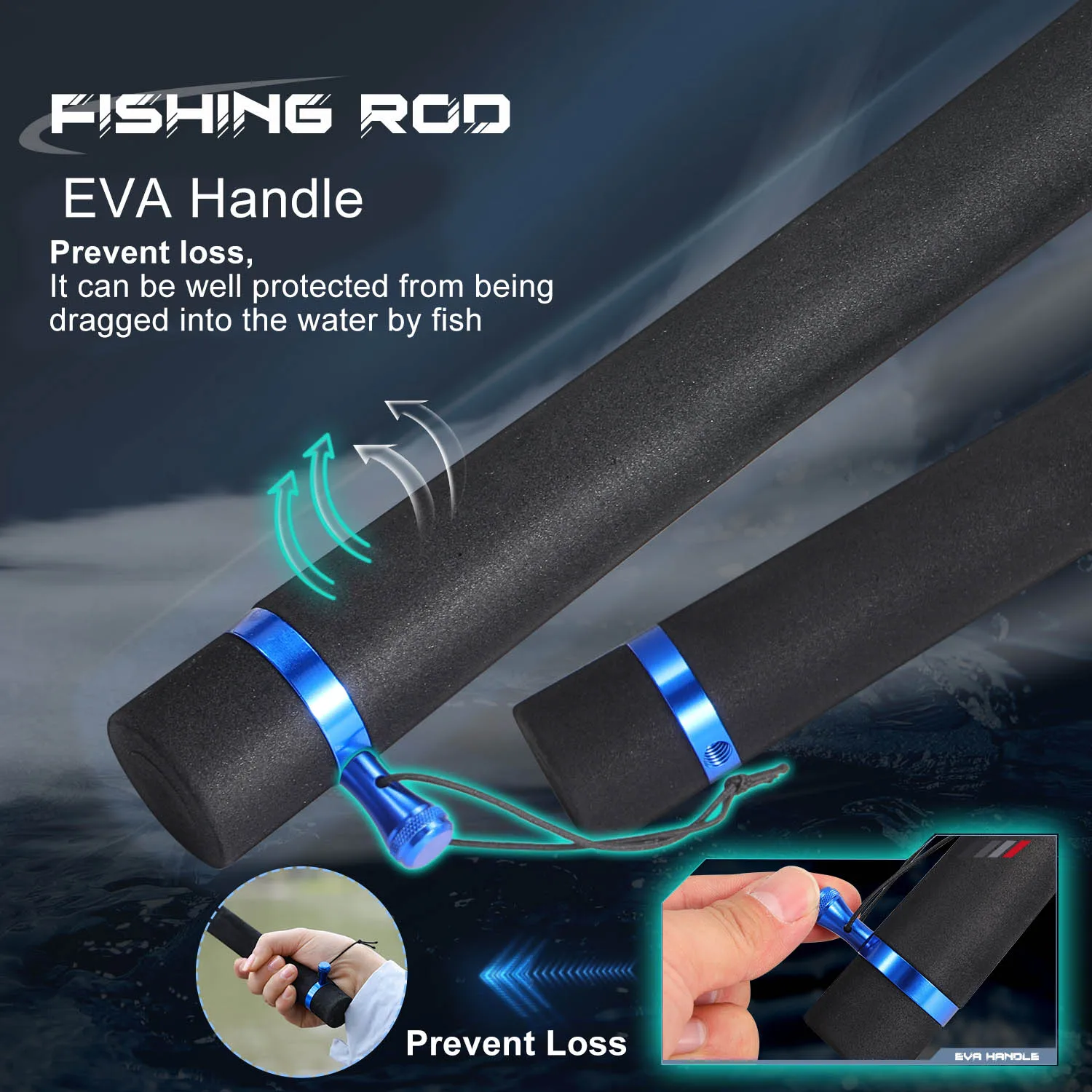 6 - Handle: Made of EVA material, it has anti slip and wear-resistant characteristics, with a comfortable hand feel. It is not easy to fatigue when held for a long time, and is equipped with anti loss design to prevent the fishing rod from being dragged into the water by the fish.