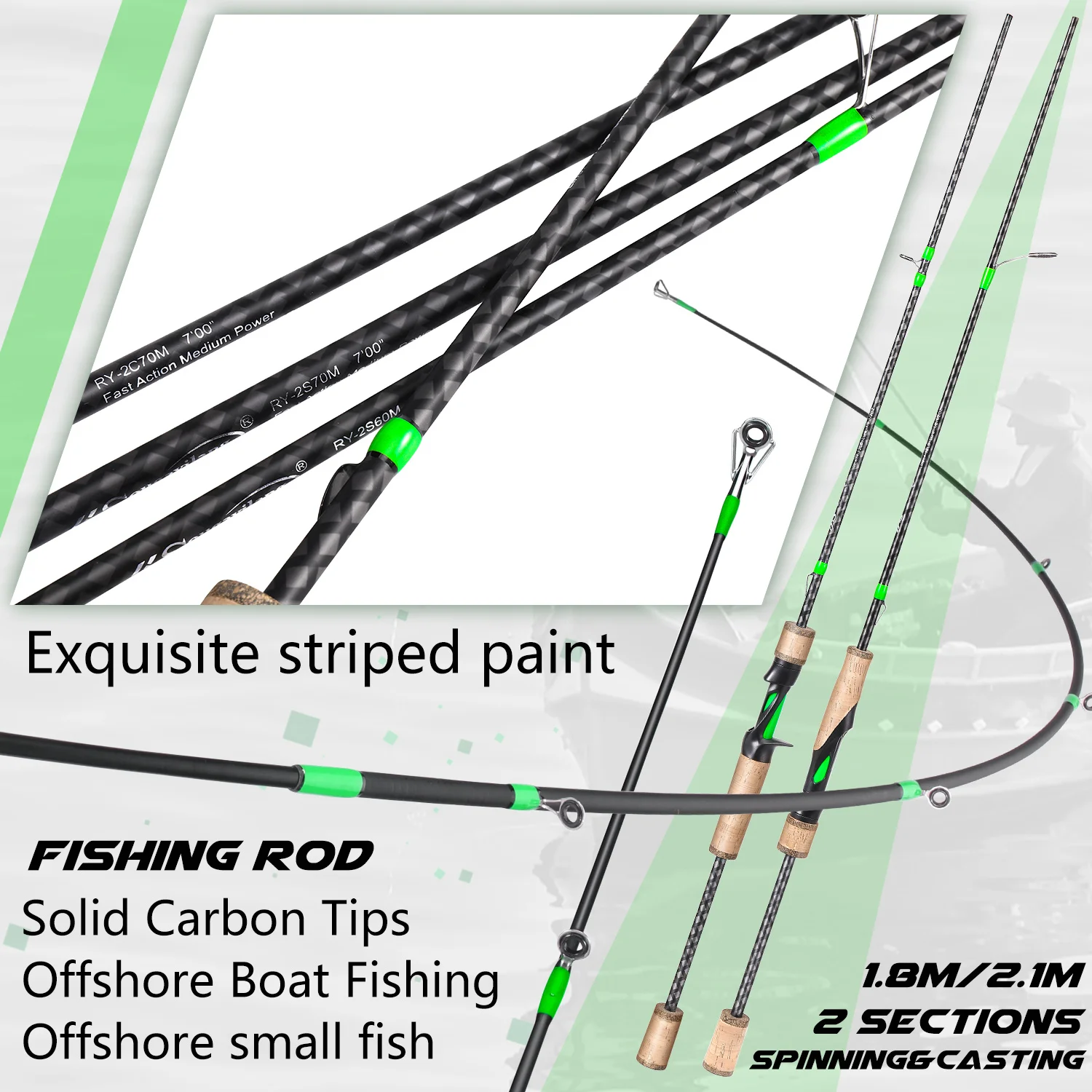 1- Product type and applicable scenarios: This fishing rod comes in two types: Spinning and Casting, with a fishing power value of M (medium). It is suitable for fishing small fish in nearshore boats or fishing in nearshore waters, and is also suitable for various freshwater bodies.